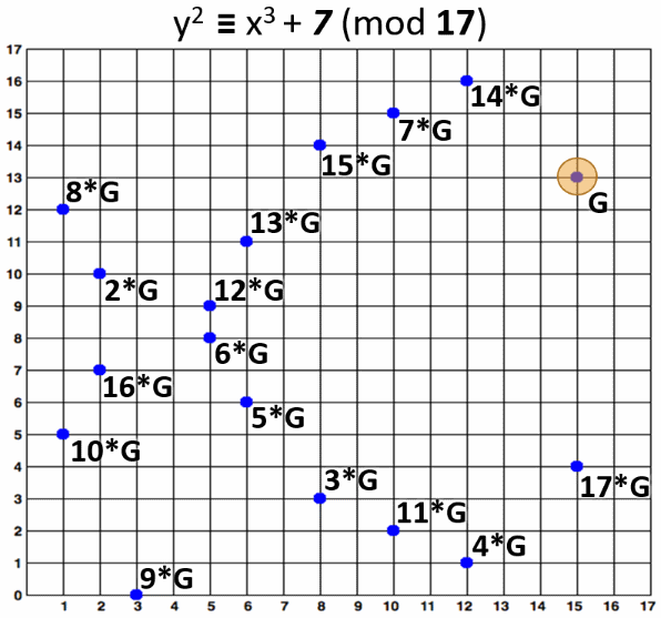 For example let's take the EC point G = {15, 13} on the elliptic curve over finite field y2 ≡ x3 + 7 (mod 17) and multiply it by k = 6. We shall obtain an EC point P = {5, 8}: