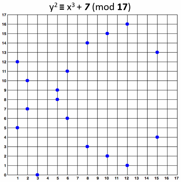 Note that the elliptic curve over finite field y2 ≡ x3 + 7 (mod 17) consists of the blue points at the above figure, i.e. in practice the "elliptic curves" used in cryptography are "sets of points in square matrix", not classical "curves".