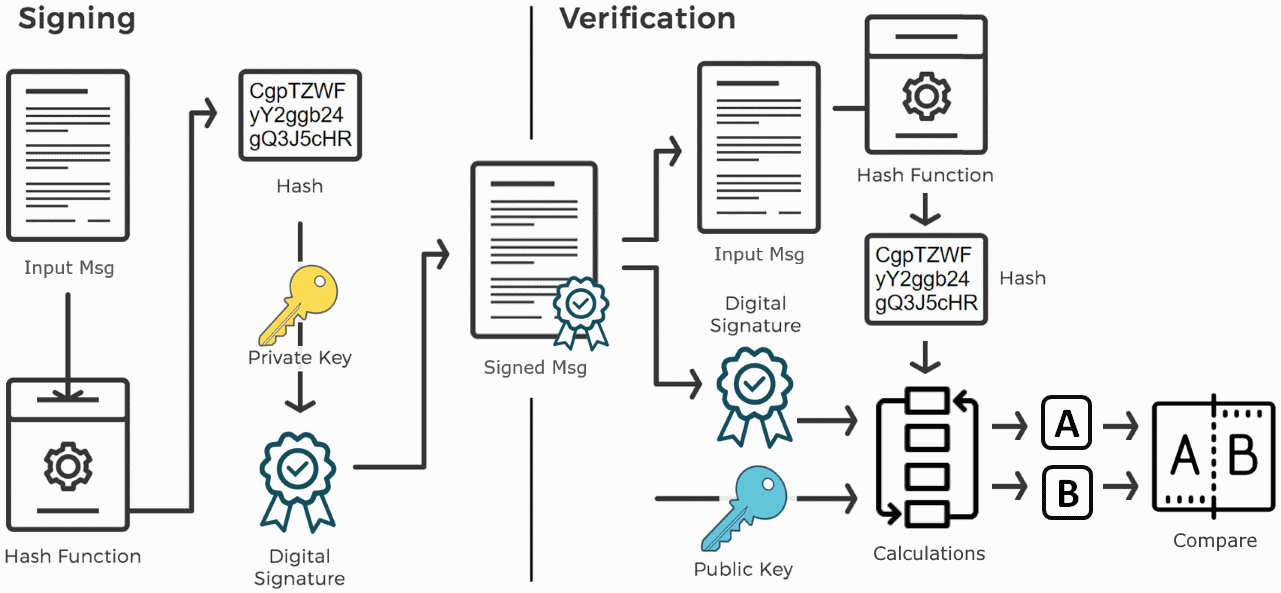 Digital signatures are a cryptographic tool to sign messages and verify message signatures in order to provide proof of authenticity for digital messages or electronic documents. Digital signatures provide: