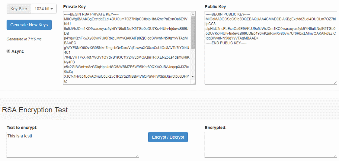 In the above online demo you can generate RSA public / private key pairs and encrypt / decrypt text messages. Note that the message size is limited by the key length, so you can't encrypt long text. You will get an error if you try. Internally, the above Web site uses the RSAES-PKCS1-v1_5 public key encryption scheme as specified in RFC3447.