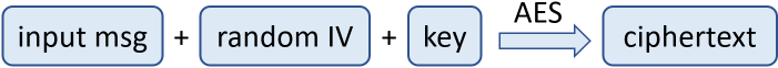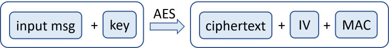 The AES encryption scheme takes as input the input msg + the encryption key. It produces as output the ciphertext + the randomly generated IV (128-bit salt) + the MAC code: